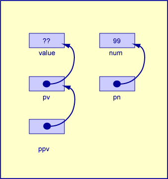 #include <stdio.h> void main ( void ) { int value, num = 99 ; int *pv= &value, *pn = &num ; int **ppv= &pv ; **ppv = *pn; /* ugly statement */ printf("**ppv = %d\n", **ppv ); }