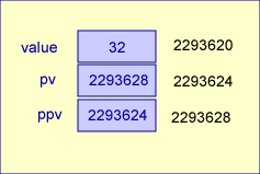 #include <stdio.h> void main ( void ) { int value; int *pv; int **ppv; value = 32; pv = (int *)&ppv; ppv = &pv; printf("value = %d\n", value ); printf("*pv = %d\n", *pv ); printf("**ppv = %d\n", **ppv ); }