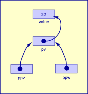 #include <stdio.h> void main ( void ) { int value; int *pv; int **ppv; int **ppw; value = 32; ________________________ ; ________________________ ; ________________________ ; printf("value = %d\n", value ); printf("**ppv = %d\n", **ppv ); printf("**ppw = %d\n", **ppw ); }