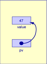 #include <stdio.h> void main ( void ) { int value; int *pv; pv = &value; *pv = 47; /* *pv on the left designates a location */ printf("value = %d\n", value ); printf("*pv = %d\n", *pv ); }