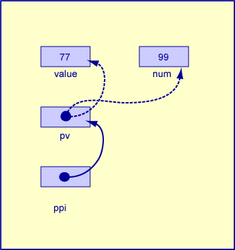 #include <stdio.h> void main ( void ) { int value = 77, num = 99 ; int *pv ; int **ppi ; ppi = &pv; pv = &value; printf("**ppi = %d\n", **ppi ); pv = # printf("**ppi = %d\n", **ppi ); }