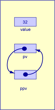 #include <stdio.h> void main ( void ) { int value; int *pv; int **ppv; value = 32; pv = (int *)&ppv; ppv = &pv; printf("value = %d\n", value ); printf("*pv = %d\n", *pv ); printf("**ppv = %d\n", **ppv ); }